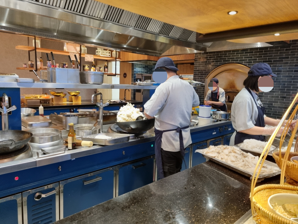 가운데 오픈키친이 있고 그 둘레로 뷔페가 세팅되어 있습니다.