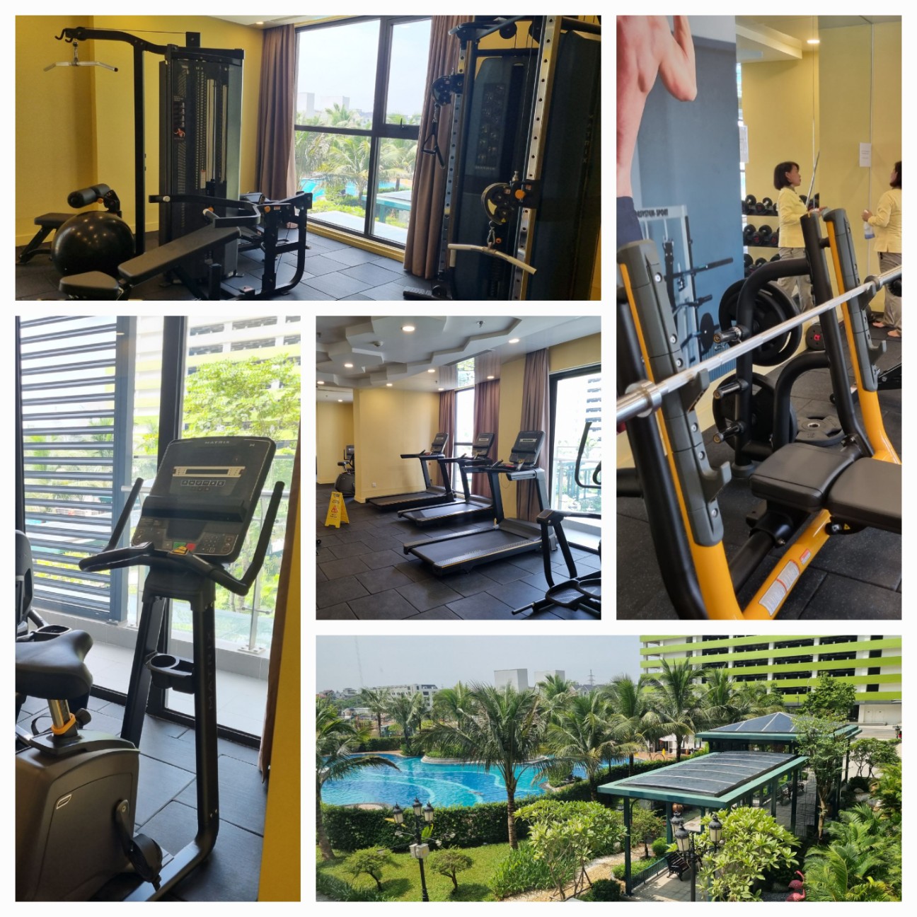 2층에 위치한 헬스장입니다. 뷰가 1층에 위치한 야외수영장 뷰입니다.